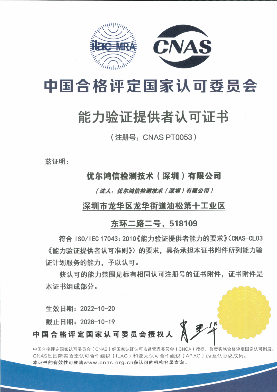 优尔鸿信.能力驗證提供者